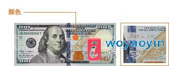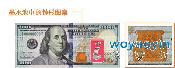 注意观察新版 100 美元钞票正面紫铜色墨水池中的钟形图案。变换角度观察钞票,会发现钟形图案从紫铜色变成绿色,呈现钟形图案在墨水池中时隐时现的效果。 两种安全特征提供了简单而微妙的方法来鉴别钞票的真伪,尤其适合在无法对着光源观察时使用。