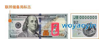肖像左侧的联邦储备局通用印章代表整个联邦储备体系。左侧序列号码下方的字母以及数字可以识别发行钞票的联邦储备银行。共有 12 家地区联邦储备银行和 24 家分行遍布美国各大城市。