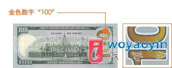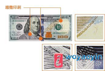 仔细观察本杰明·富兰克林的衣领、出现肖像水印处的边缘空白区域、金色羽毛笔上,以及钞票四周边缘,会看到印刷的小字。