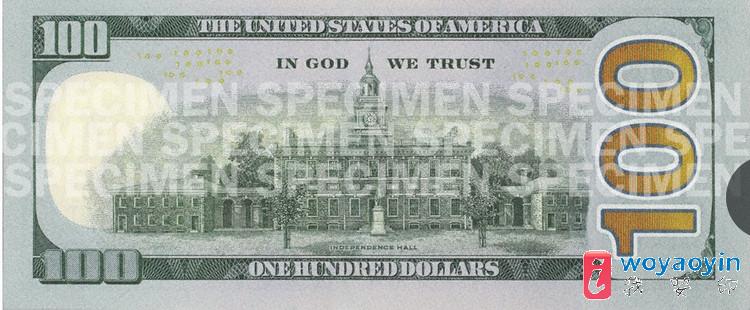 新版 100 美元钞票正面仍保留美国开国元勋之一本杰明·富兰克林的肖像。钞票背面使用新的独立纪念馆图案,其显示的是纪念馆的背面而非正面。去除了肖像和图案四周的椭圆形,图像比以前更大。