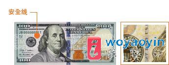 将钞票对着光源,可在肖像左侧看到嵌入纸币的垂直安全线。在安全线上交替压印有字母“USA”和数字“100”,在钞票两面均可看到。在紫外线照射下,安全线会发出粉红光。