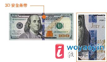 注意观察新版 100 美元钞票正面的蓝色条带,上面有钟形图案和数字“100”。将钞票前后倾斜,同时注意观察条带。您将看到,在移动过程中,钟形图案会变成数字“100”。将钞票前后倾斜,钟形图案和数字“100”会左右移动。如果左右倾斜,它们将上下移动。安全条带是织入纸币,而不是印制在纸币上的,同时应用了先进的微技术。使用了近百万个微型透镜,以产生移动钟形图案和数字“100”的视觉效果。