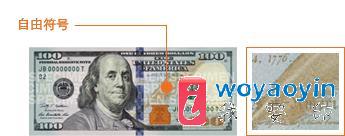 新版 100 美元钞票在肖像右侧印有美国自由符号:摘自《独立宣言》的名言和开国元勋用来签署该历史文献的羽毛笔。