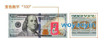 将钞票倾斜,会看到钞票正面右下角的数字“100”从紫铜色变为绿色。