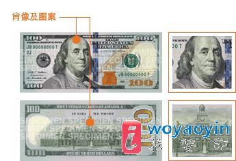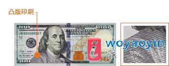 把手指放在钞票左侧本杰明·富兰克林肖像的肩部上下触摸。因为该图像是用凹雕印刷工艺制作的,因此会有一种凹凸感。整张 100 美元钞票大部分均用传统凹版印刷工艺制作,使得美元真钞具有与众不同的纹理。