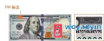 新版 100 美元钞票由分别位于得克萨斯州沃思堡市和华盛顿特区的两家印刷厂负责印制。沃思堡市 印刷厂印制的新版 100 美元钞票在其正面左上角数字“100”的右边印有小字母“FW”。钞票上如果没有 FW 标志,则表明是在华盛顿特区印制的。